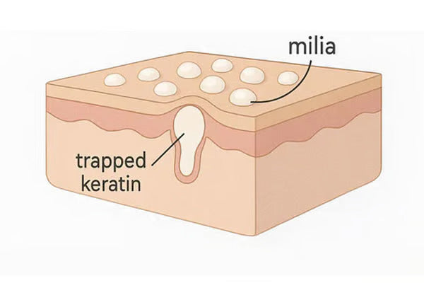 Milia are small white bumps that form when keratin gets trapped under the skin. They’re not pimples — they stay smooth and white beneath the surface.